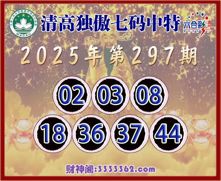 297期:『清高独傲』 🧩七码中特🧩【02.03.08.18.36.37.44】开:44