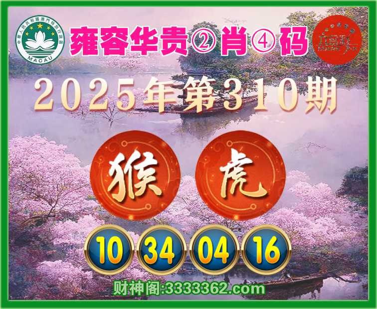 310期:〖雍容华贵〗 🧤②肖④码🧤【猴】【10.34.04.16】开:虎16