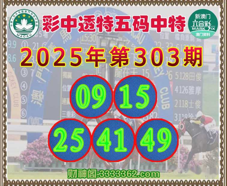 303期:【彩中透特】 👛五码中特👛【09.15.25.41.49】开:15