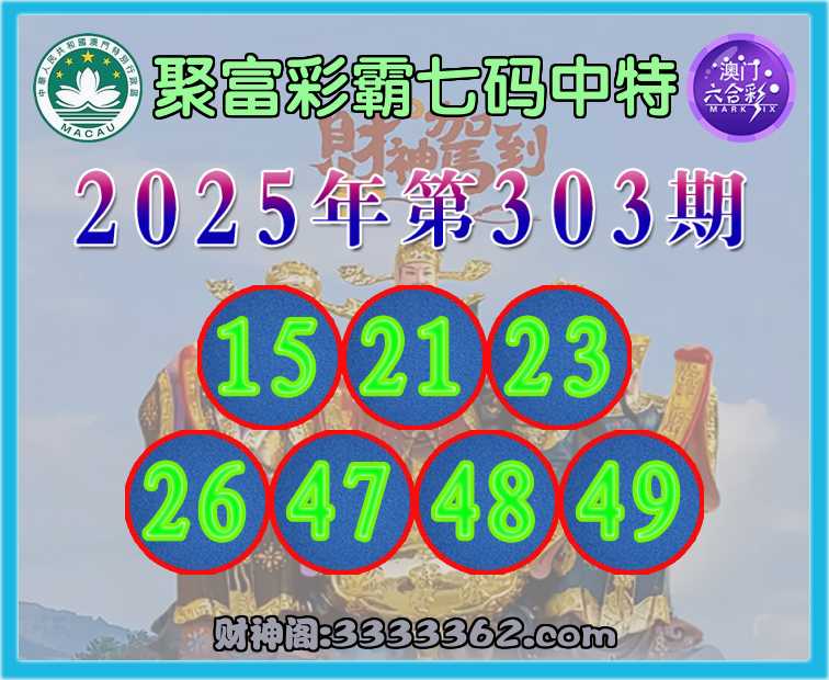 303期:〖聚富彩霸〗 ✌️七码中特✌️【15.21.23.26.47.48.49】开:15