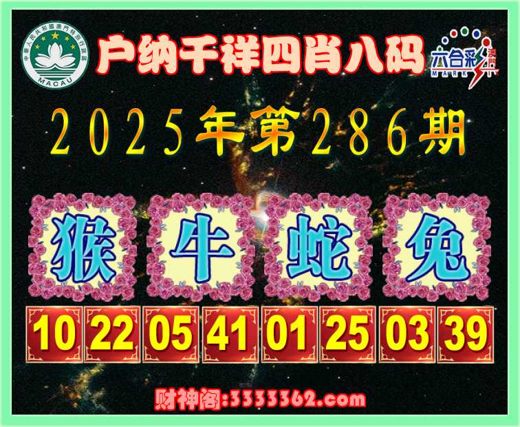 286期:《户纳千祥》 🏇四肖八码🏇【猴牛蛇】开:兔03