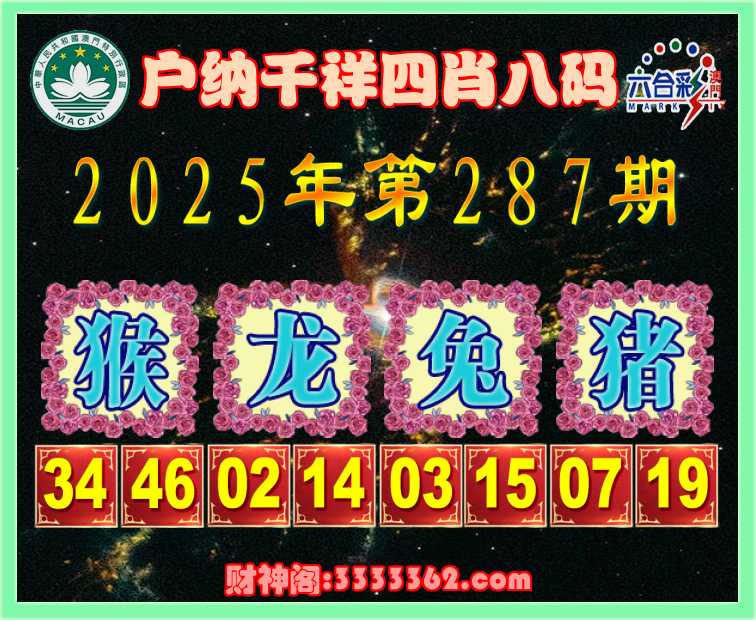 287期:《户纳千祥》 🏇四肖八码🏇【龙兔猪】开:猴34