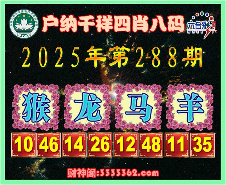 288期:《户纳千祥》 🏇四肖八码🏇【猴马羊】开:龙14